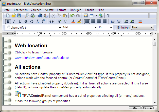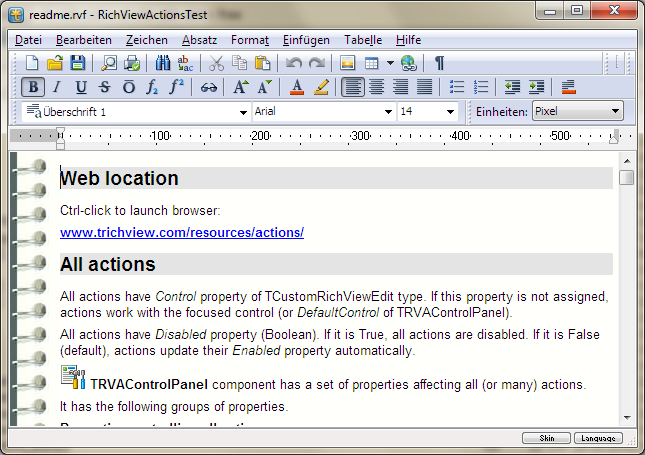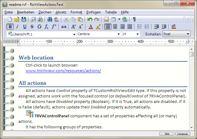 Sie können nur ein neues Set von Style templates auf bestehende Dokumente anwenden, damit sich ihr Aussehen verändert. Style templates werden unterstützt von RichViewActions. Sie bieten einen Dialog für ein Formatvorlagenmanagement (Formatvorlagen hinzufügen, löschen, bearbeiten) und eine Kombobox zur Formatvorlagenanwendung auf Ihre Auswahl.